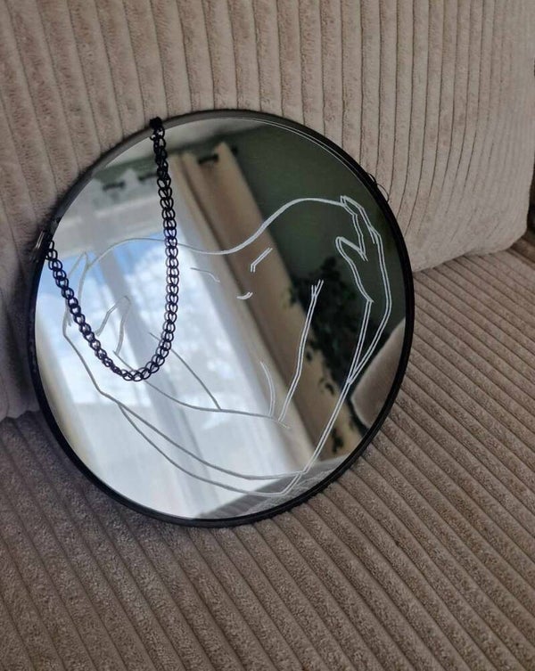Un miroir rond suspendu par une fine chaîne dorée, gravé à la main d’un buste féminin qui se serre tendrement dans ses bras. Un symbole puissant et délicat d’amour de soi, de douceur et d’acceptation.